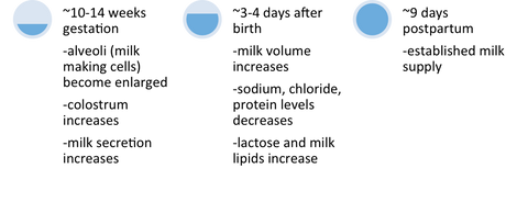 As for your breast milk supply, it does change over time and will give the physical feeling and appearance of “coming in.” More importantly, your breast milk’s nutritional makeup changes as your baby begins to grow, even day by day! This handy chart shows the changes of breast milk in the body.