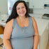 Woman wearing grey nursing tank top, pulling front down showing nursing feature